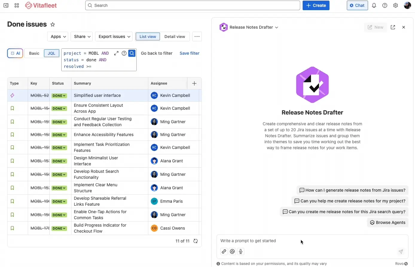 Drafting release notesAI can generate release notes from Jira issues by identifying common themes across issues, presenting a summary and list of released issues in a problem-solution format.
