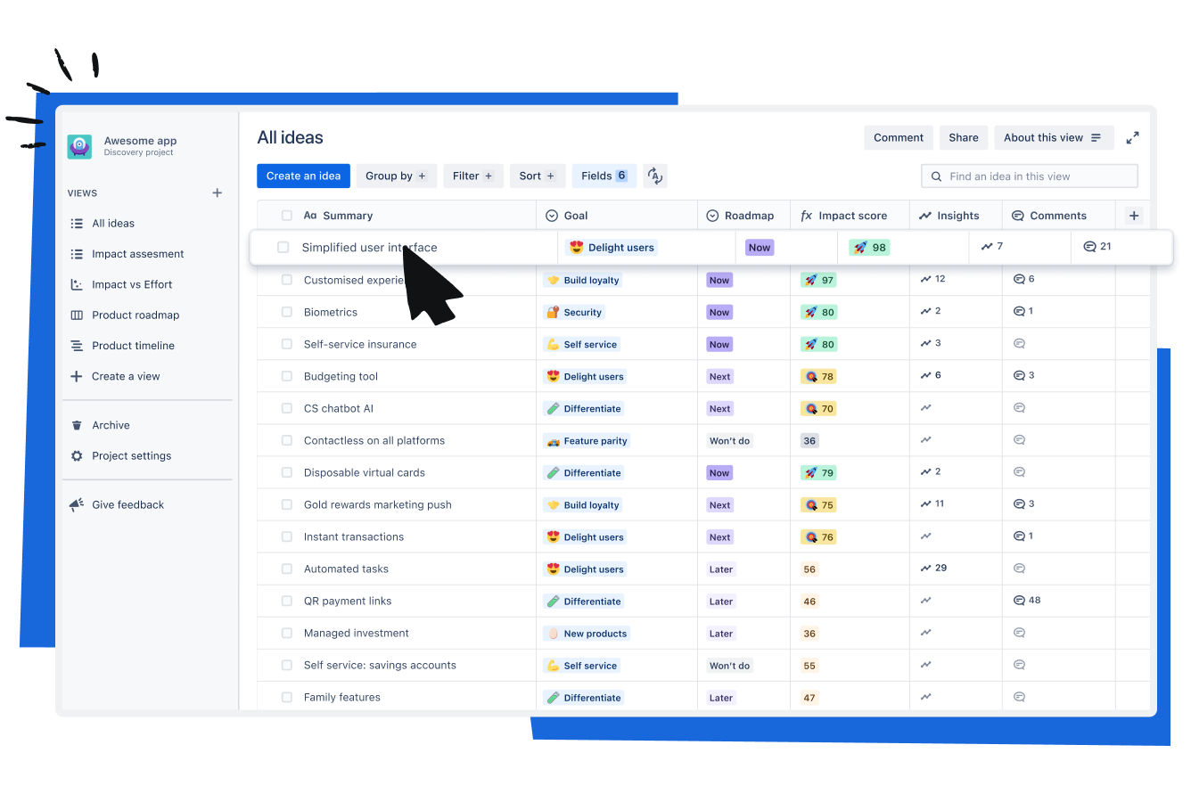 Your team can evaluate and rank ideas to pursue the most viable ones first. Collaboration tools within Jira Product Discovery allow team members to comment, vote, or react to ideas, and its integration with Jira enables a seamless transition from idea management to project execution.