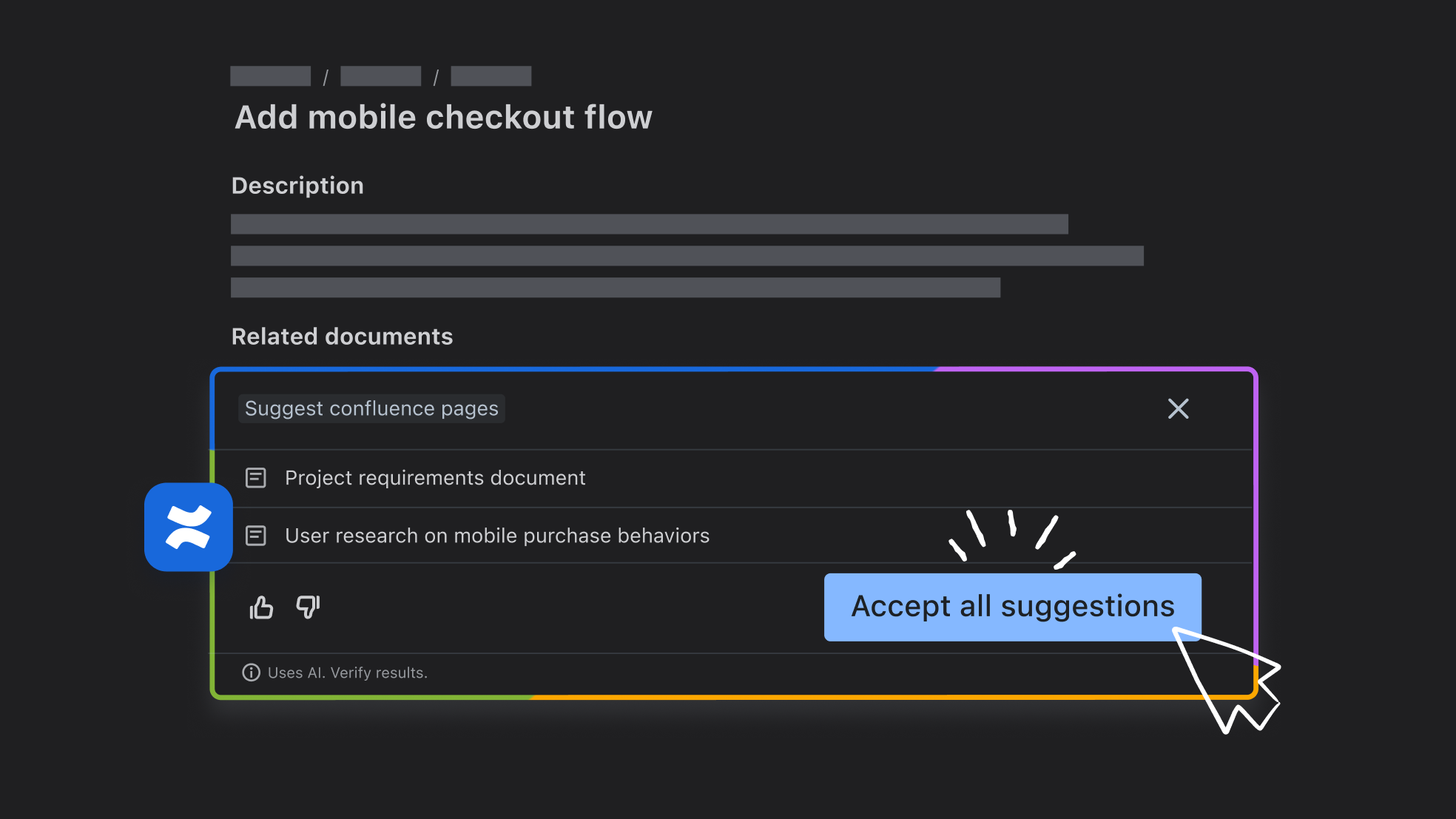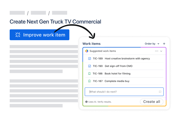 Create work items from your favorite tools, then use Rovo AI to break down big ideas, polish descriptions, and link relevant resources in a snap.