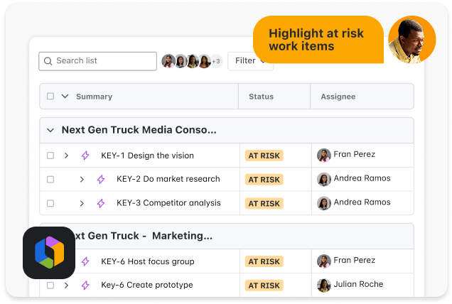 Manage work across teams and let AI agents keep you updated on status and potential risks