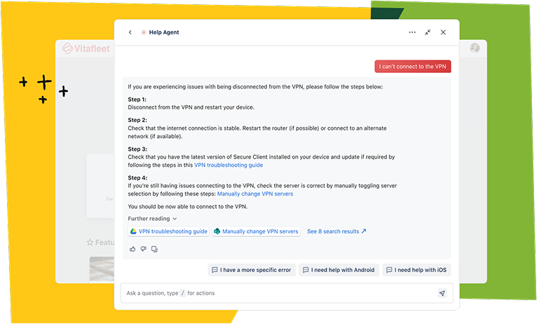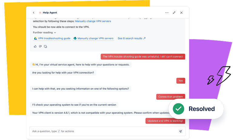Instantly answer employee questions with AI agents that draw on existing knowledge. Plus, AI is always spotting knowledge gaps and drafting new articles so your front-line support keeps getting better.