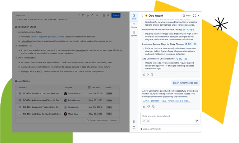 Leave post-incident reviews to AI. Generate an incident summary quickly so Ops teams can save time, learn from past incidents, and pass along critical insights to prevent similar incidents in the future.