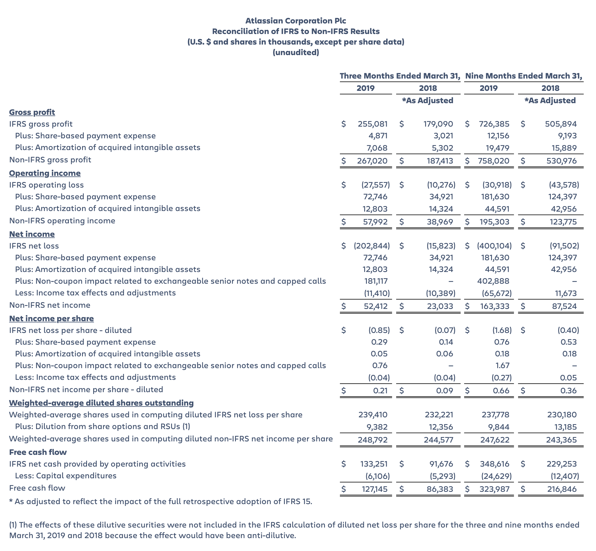 With respect to Atlassian’s expectations under “Financial Targets” above, a reconciliation of IFRS to non-IFRS gross margin, operating margin, net income (loss) per diluted share, and free cash flow has been provided in the financial statement tables included in this press release.