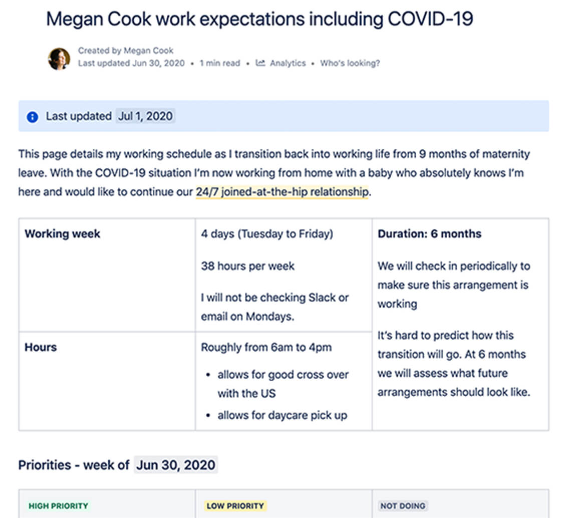 Personally, I found that clear boundaries are important when working remotely. I created a Confluence page that clearly states when I work, when I’m available (and in what time zone), and what my priorities are for the week. While Slack is a useful tool for remote work, it can also distract from focused work, which is why I state that I will not check it on Mondays (as well as email).