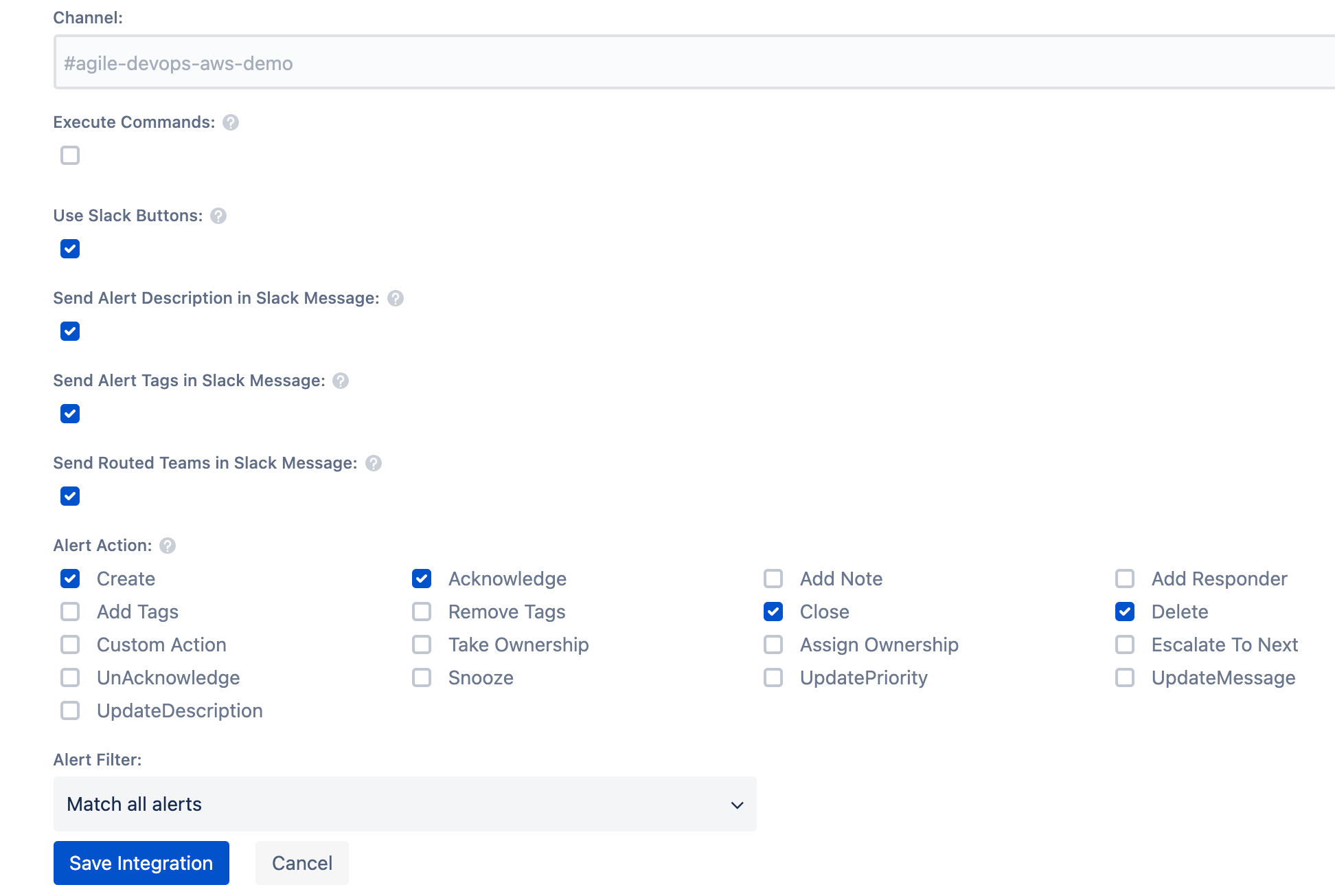 Scroll down, and adjust the Alert actions to fit your needs. The integration below is set to update Slack when an alert is Created, Acknowledged, Closed, or Deleted. Click Save Integration to proceed.